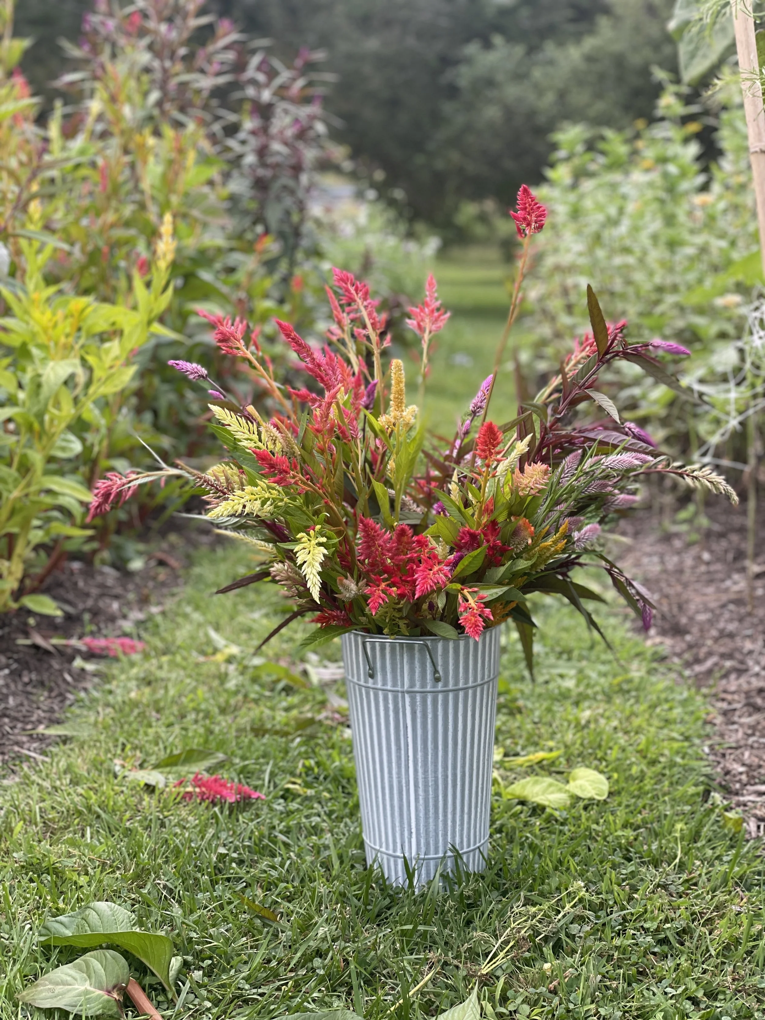 A metal bucket containing a colorful arrangement of pink, red, yellow, and purple flowers placed on grass in a garden with rows of plants and trees in the background.