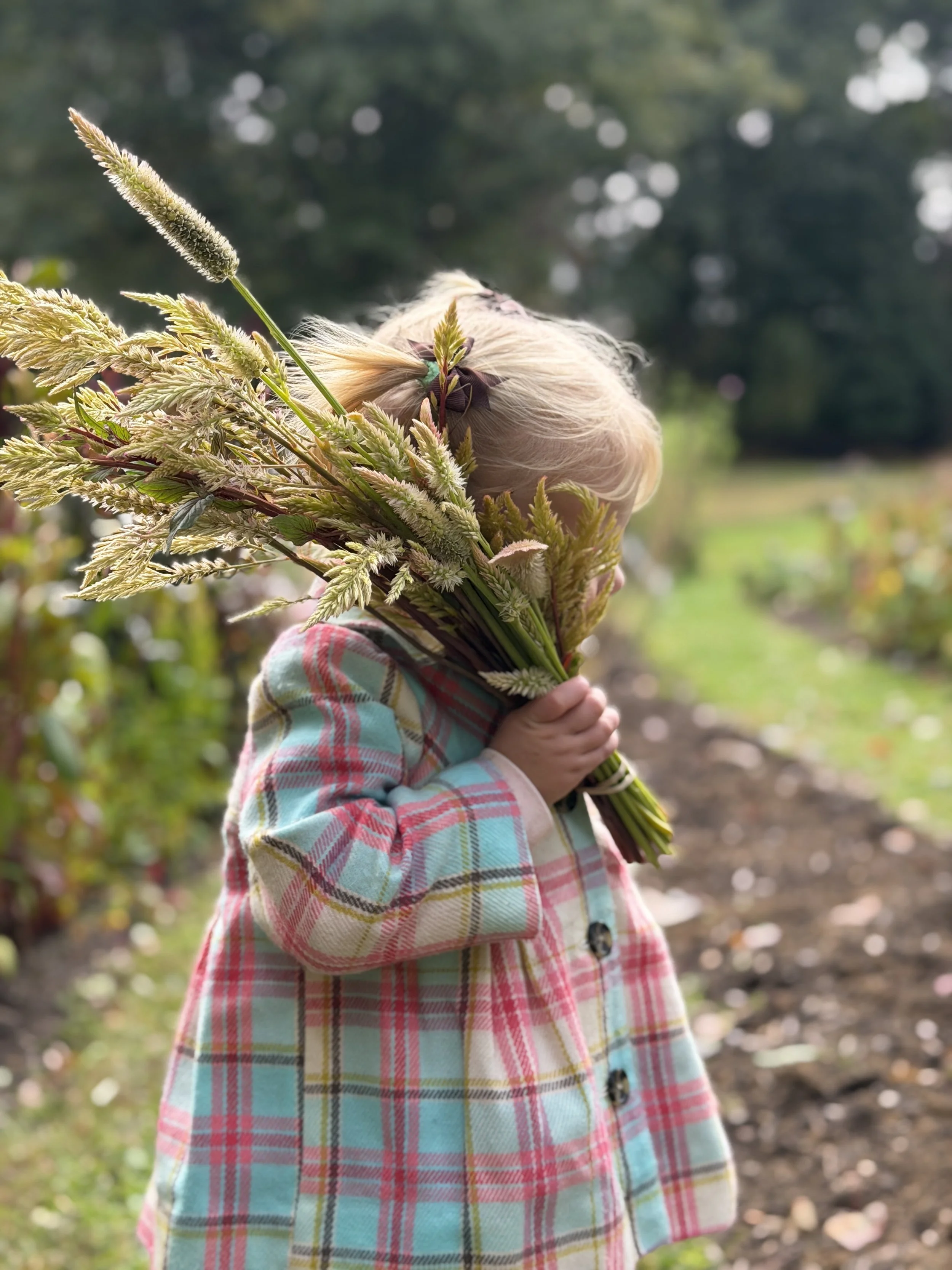 A young girl with blonde hair in pigtails, dressed in a colorful plaid coat, holding a large bouquet of assorted wildflowers and grasses, standing outdoors in a garden or field.