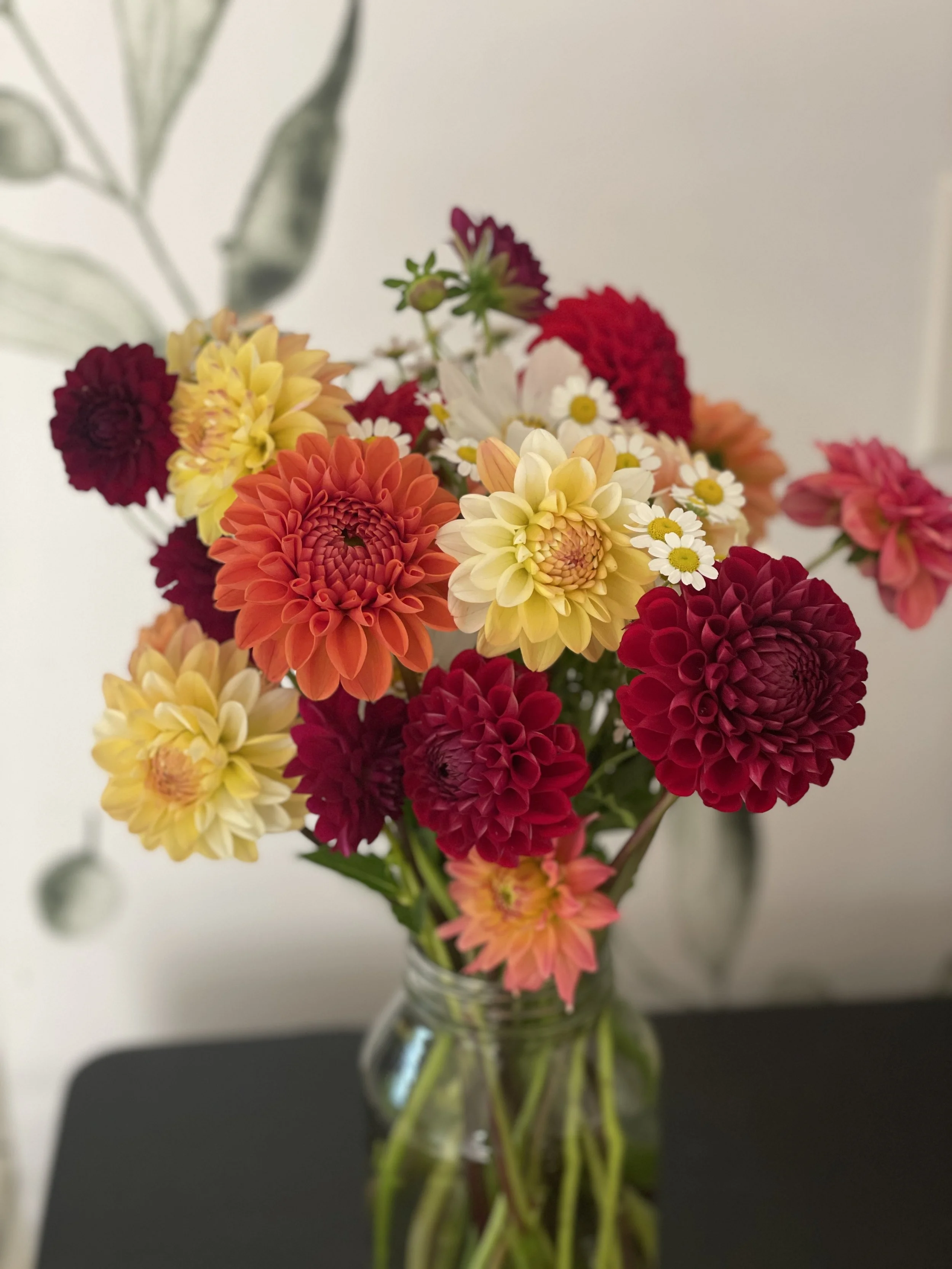 Colorful bouquet of various flowers including dahlias and daisies in a clear glass vase on a dark surface against a light background.