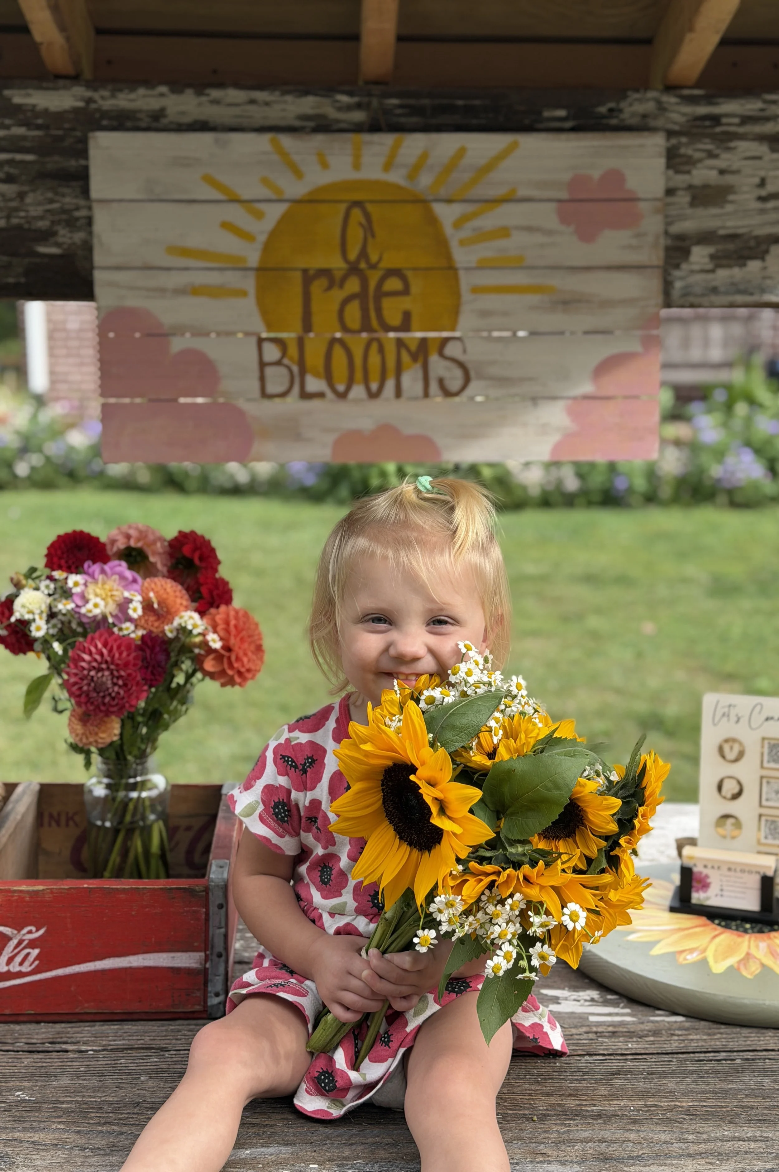 A young girl sitting on a wooden surface, holding a bouquet of sunflowers and daisies, smiling. Behind her are vases of colorful flowers, a rustic decorative sign that reads 'A Rae Blooms' with a sun and clouds, and a garden background.