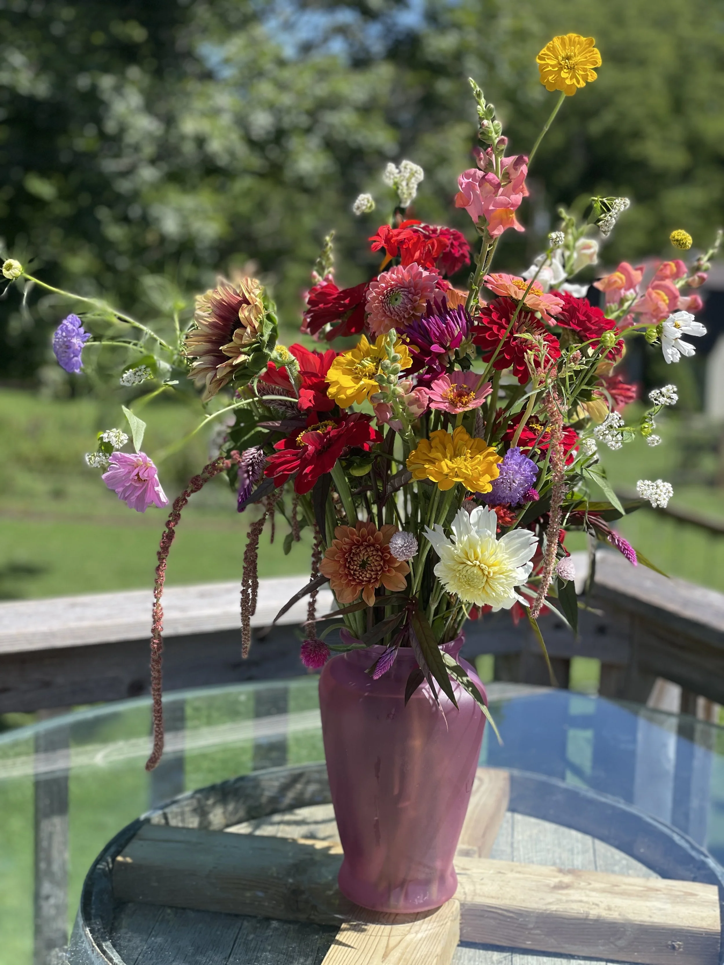 Colorful bouquet of various flowers in a pink vase on a glass-topped wooden table outdoors with greenery in the background.